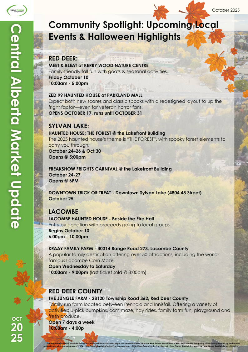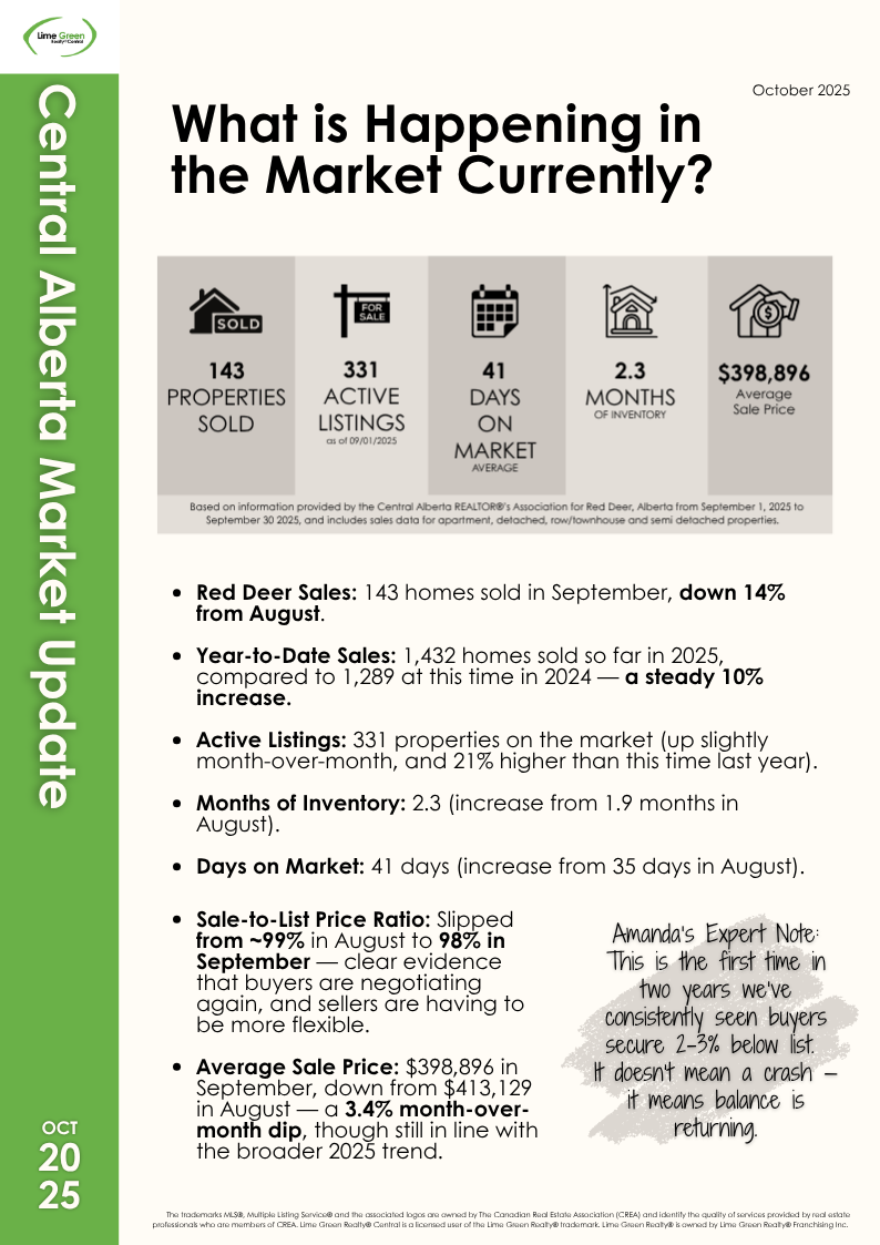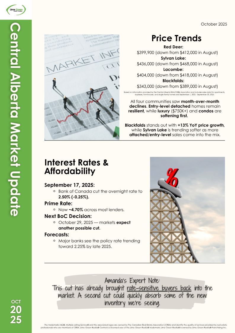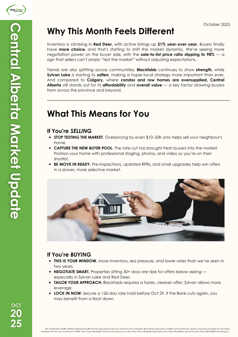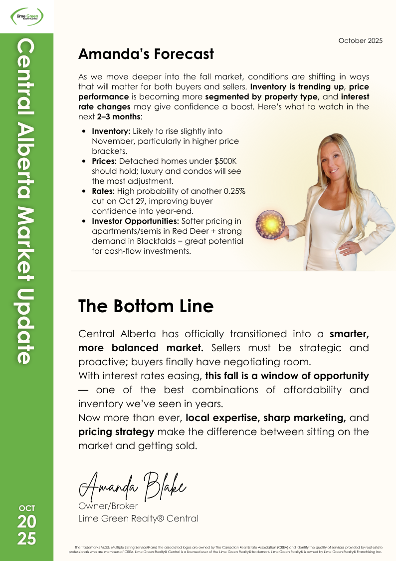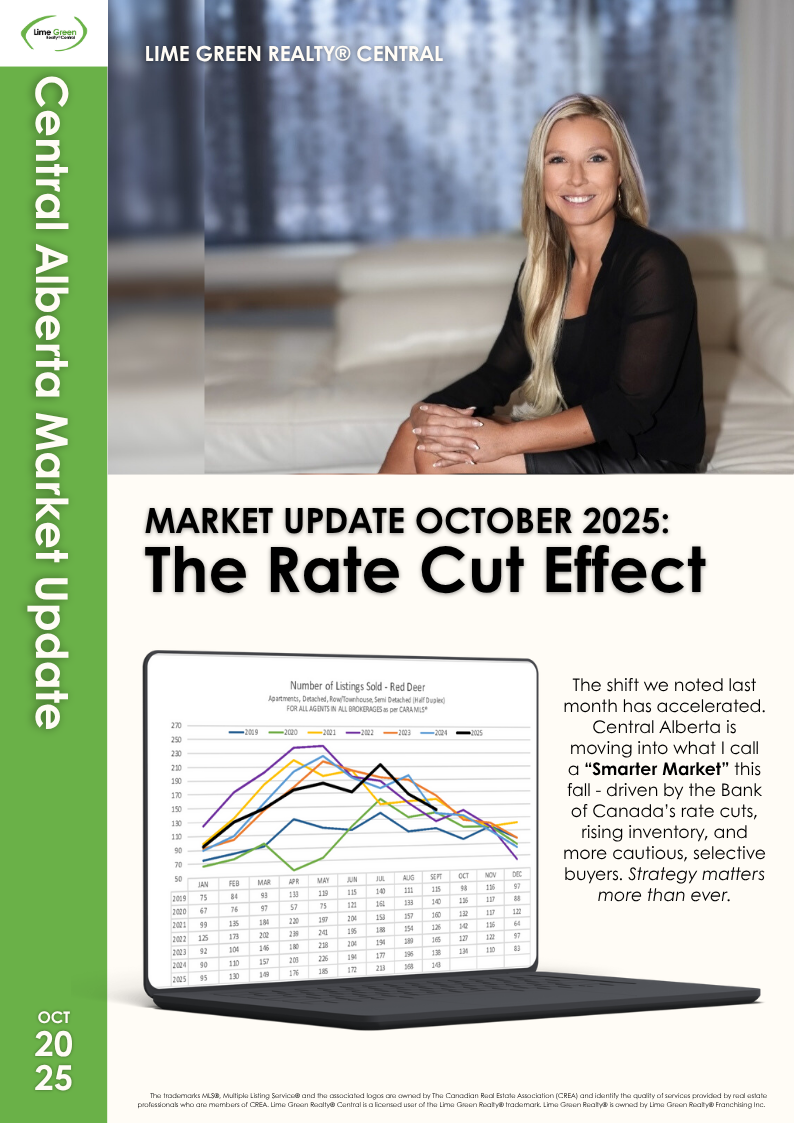 The shift we noted last month has accelerated. Central Alberta is moving into what I call a “Smarter Market” this fall, driven by the Bank of Canada’s rate cuts, rising inventory, and more cautious, selective buyers. Strategy matters more than ever.