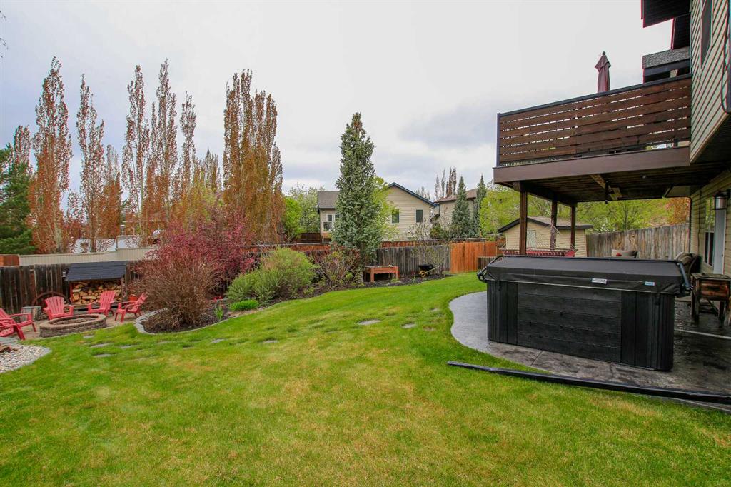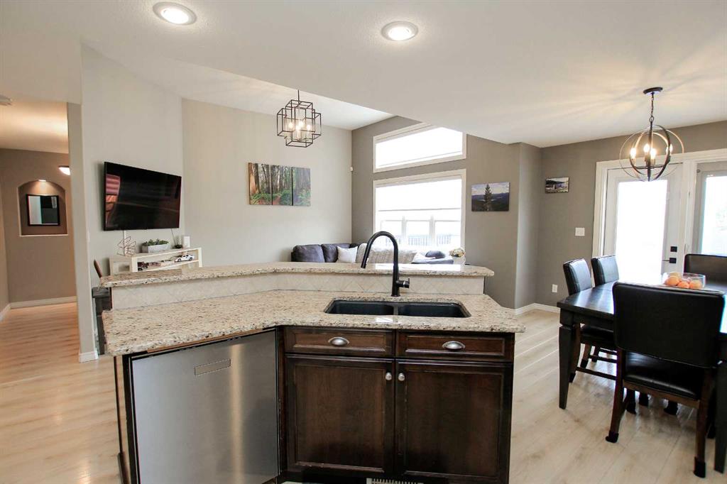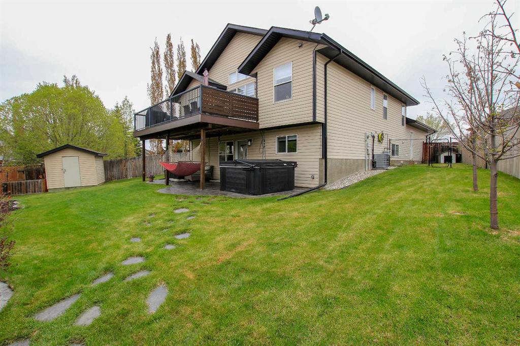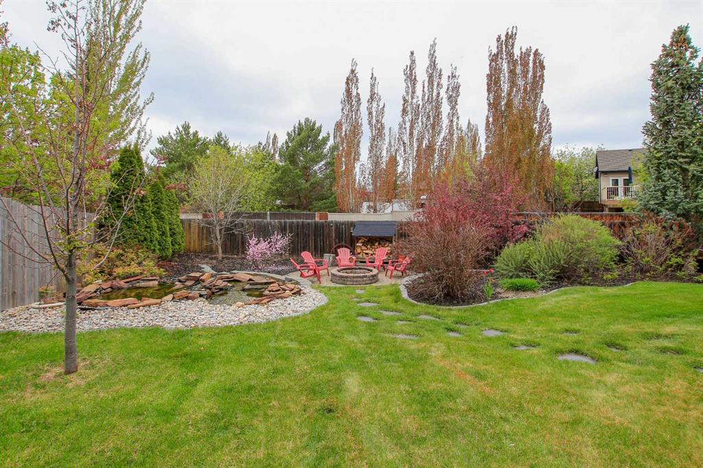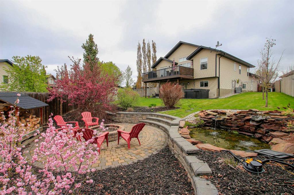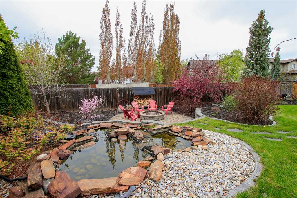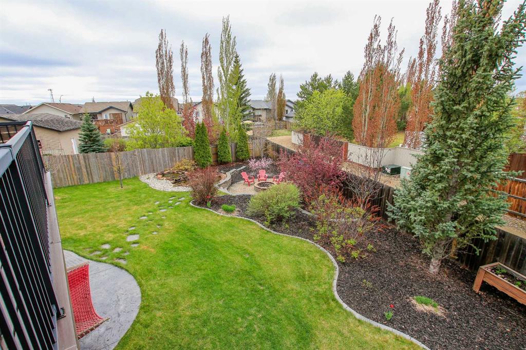FULLY DEVELOPED 4 BEDROOM, 3 BATHROOM BI-LEVEL ~ LOCATED IN A CLOSE ON A LARGE PIE LOT ~ BEAUTIFULLY LANDSCAPED WEST FACING BACK W/KOI POND ~ Covered front entry welcomes you and leads to a large sun filled foyer with raised ceilings, ample closet space and convenient access to the garage ~ Open concept main floor layout is complemented by high ceilings ~ The living room features raised ceilings and has an oversized west facing window that allows natural light to fill the space ~ The kitchen offers an abundance of dark stained cabinets, granite counter tops, island with a raised eating bar, full tile backsplash and a large walk in pantry ~ Easily host large gatherings in the dining room with garden door access to the west facing deck, featuring composite deck boards and a BBQ gas line ~ The primary bedroom can easily accommodate a king bed plus multiple pieces of furniture, has a large walk in closet with built in shelving and organizers, and offers a spa like ensuite featuring a huge walk in tile shower with two shower heads ~ Second main floor bedroom is conveniently located next to the 4 piece main bathroom ~ The fully finished walkout basement has large above grade windows and offers a large family room with a wet bar, gas fireplace with floor to ceiling tile and a separate entrance leading to the lower covered patio, hot tub (included with the sale) and backyard ~ 2 additional bedrooms are both a generous size and have ample closet space ~ 4 piece bathroom features heated tile floors and an extra deep soaker tub ~ Front load laundry pair, with pedestals, are located in their own room ~ 24' L x 22' W attached garage is insulated, finished with painted drywall, and has a man door to a fenced in dog run and the backyard ~ The sunny west facing backyard is beautifully landscaped with well established trees, shrubs and perennials, plus a large covered patio and hot tub area, a relaxing koi pond with a waterfall next to the stone fire pit, includes a garden shed and is fully fenced with back alley access ~ Located in a key hole close, walking distance to multiple schools, parks, playgrounds, walking trails and with easy access to shopping and all other amenities.