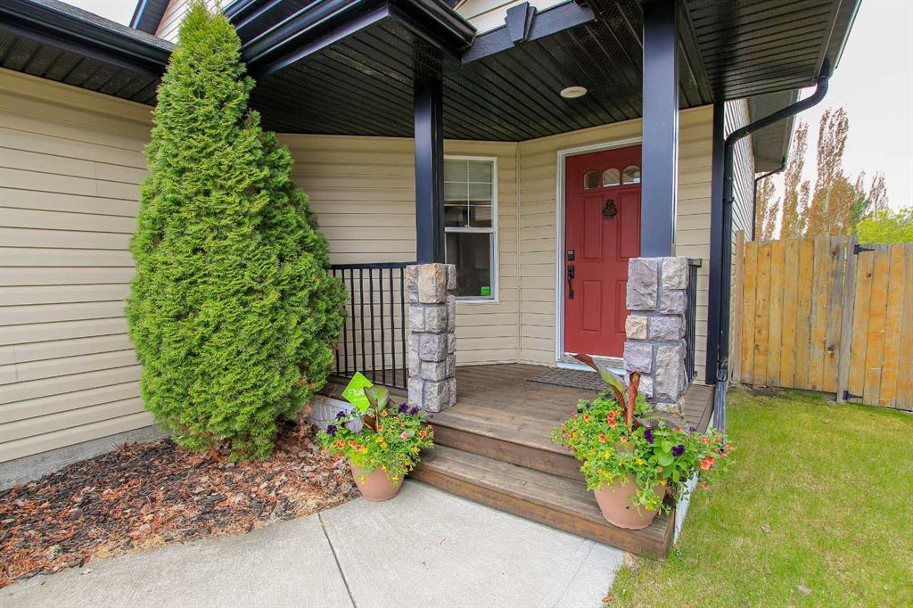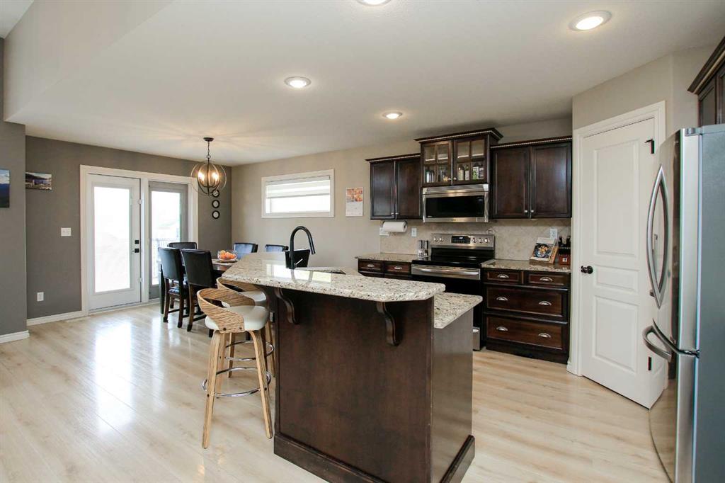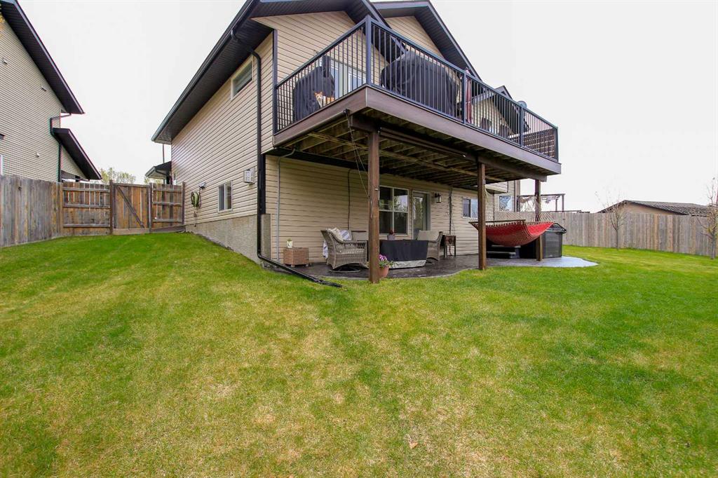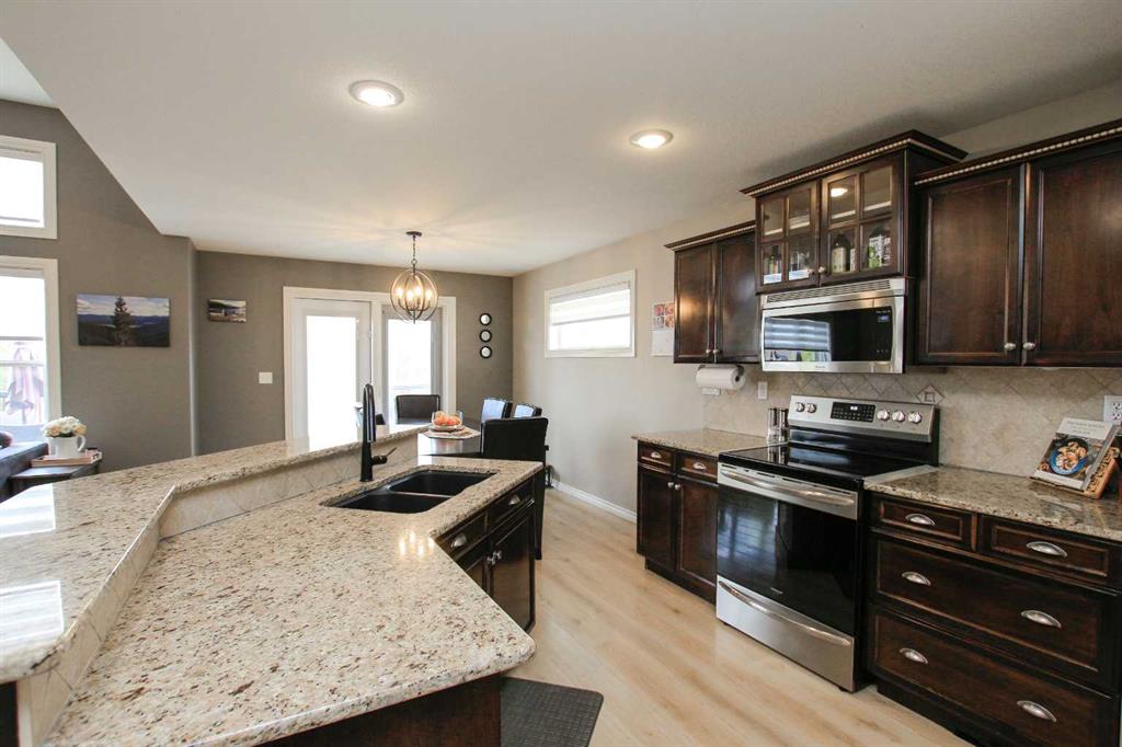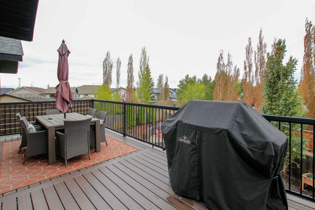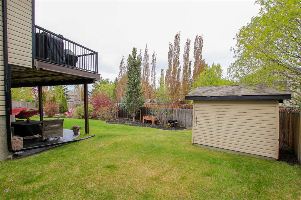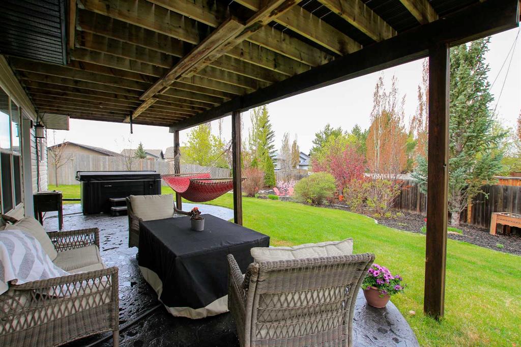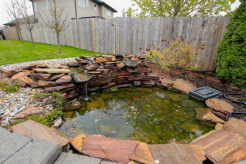 FULLY DEVELOPED 4 BEDROOM, 3 BATHROOM BI-LEVEL ~ LOCATED IN A CLOSE ON A LARGE PIE LOT ~ BEAUTIFULLY LANDSCAPED WEST FACING BACK W/KOI POND ~ Covered front entry welcomes you and leads to a large sun filled foyer with raised ceilings, ample closet space and convenient access to the garage ~ Open concept main floor layout is complemented by high ceilings ~ The living room features raised ceilings and has an oversized west facing window that allows natural light to fill the space ~ The kitchen offers an abundance of dark stained cabinets, granite counter tops, island with a raised eating bar, full tile backsplash and a large walk in pantry ~ Easily host large gatherings in the dining room with garden door access to the west facing deck, featuring composite deck boards and a BBQ gas line ~ The primary bedroom can easily accommodate a king bed plus multiple pieces of furniture, has a large walk in closet with built in shelving and organizers, and offers a spa like ensuite featuring a huge walk in tile shower with two shower heads ~ Second main floor bedroom is conveniently located next to the 4 piece main bathroom ~ The fully finished walkout basement has large above grade windows and offers a large family room with a wet bar, gas fireplace with floor to ceiling tile and a separate entrance leading to the lower covered patio, hot tub (included with the sale) and backyard ~ 2 additional bedrooms are both a generous size and have ample closet space ~ 4 piece bathroom features heated tile floors and an extra deep soaker tub ~ Front load laundry pair, with pedestals, are located in their own room ~ 24' L x 22' W attached garage is insulated, finished with painted drywall, and has a man door to a fenced in dog run and the backyard ~ The sunny west facing backyard is beautifully landscaped with well established trees, shrubs and perennials, plus a large covered patio and hot tub area, a relaxing koi pond with a waterfall next to the stone fire pit, includes a garden shed and is fully fenced with back alley access ~ Located in a key hole close, walking distance to multiple schools, parks, playgrounds, walking trails and with easy access to shopping and all other amenities.