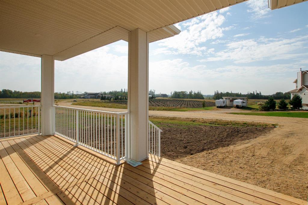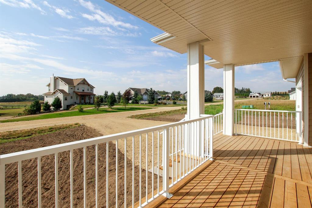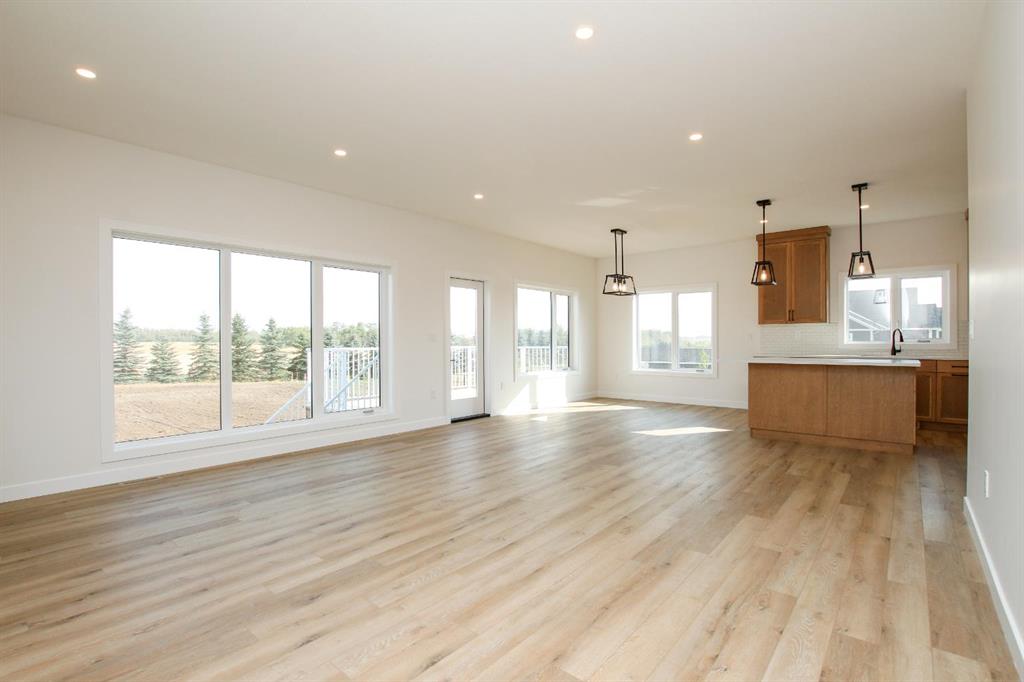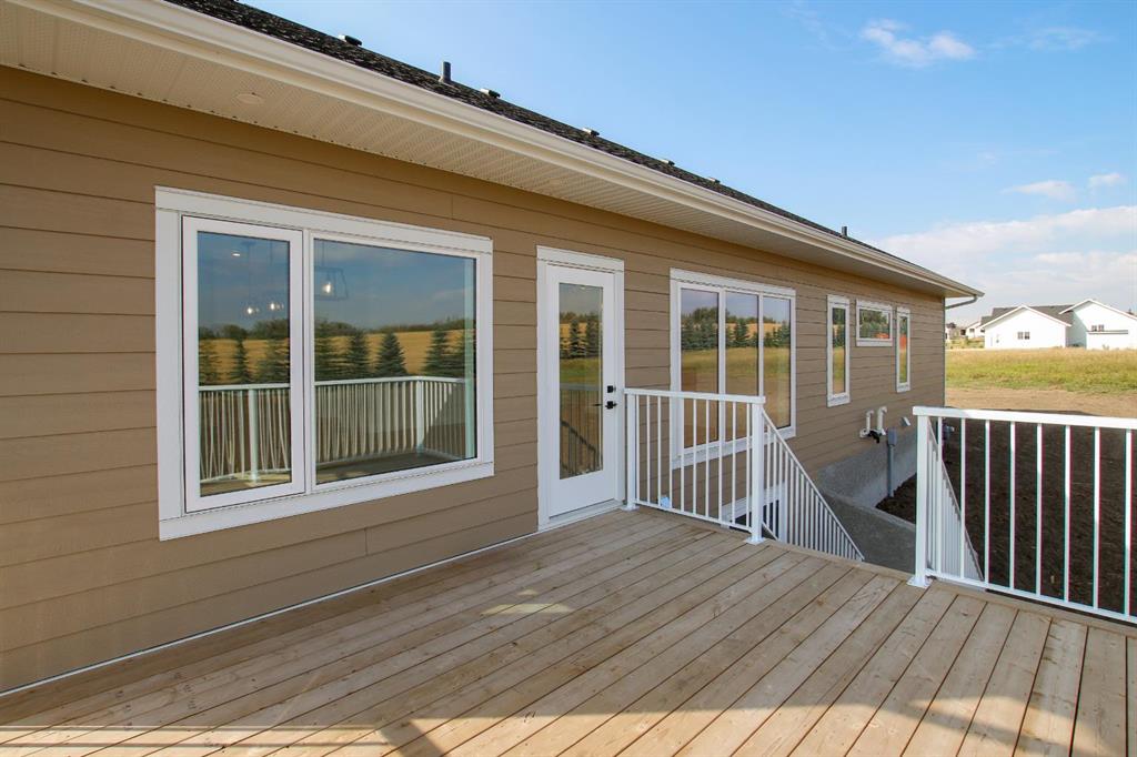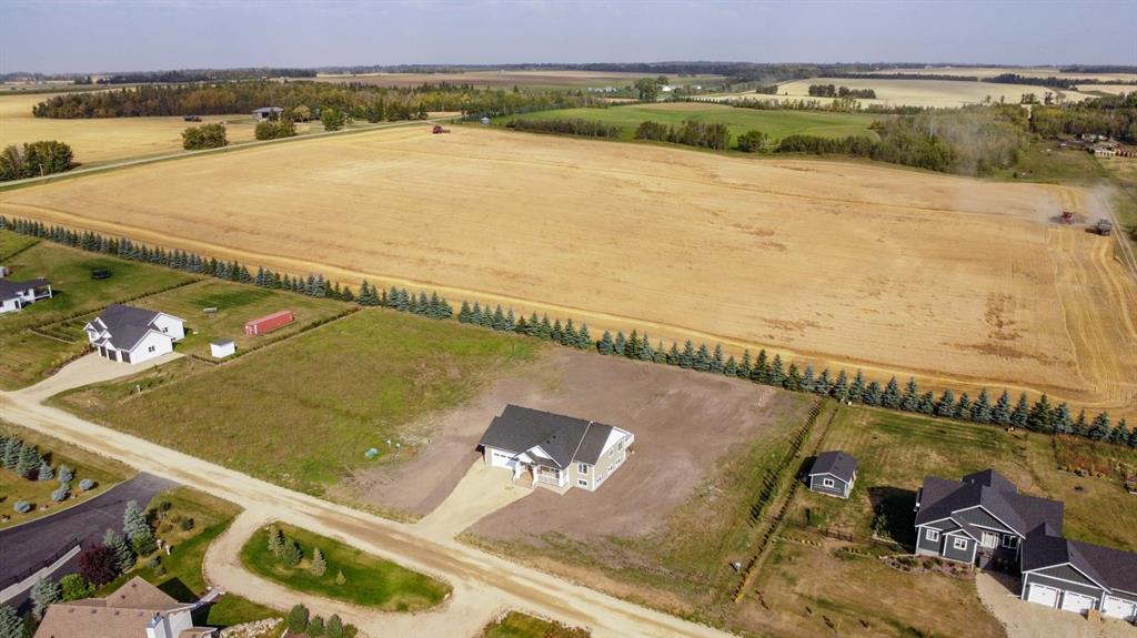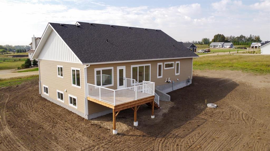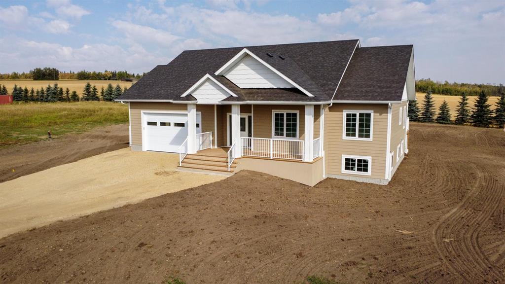 BRAND NEW BUNGALOW LOADED WITH UPGRADES THROUGHOUT ~ LOCATED ON 1 ACRE IN COUNTRY RIDGE ESTATES ~ IMMEDIATE POSSESSION AND MOVE IN READY ~ Durable composite siding, and a covered front veranda spanning over 22' wide create eye catching curb appeal, and welcome you to this brand new home ~ The welcoming foyer has high ceilings, vinyl plank flooring and convenient access to the attached garage ~ The open concept main floor layout is complemented by high ceilings, durable, stylish vinyl plank flooring, and an abundance of large windows that fill the space with natural light ~ The living room is centred by a cozy fireplace with a mantle and wiring for your TV ~ The kitchen is beautifully finished with custom built, warm stained cabinets, full tile backsplash, tons of quartz counter space including an island with an eating bar, undermount sink with a window above, and a wall pantry ~ Easily host large gatherings in the dining room that's filled with natural light from the large windows with country views ~ A garden door leads to a 13' x 12' deck with aluminum railings, that overlooks the backyard and has more great country views ~ More large windows in the king size primary bedroom that features a spacious walk in closet with built in organizers, and 5 piece ensuite offering dual sinks, a 6' soaker tub, and walk in shower ~ 2 additional bedrooms are both a generous size with ample closet space and large windows ~ 4 piece bathroom has an extra deep soaker tub with a tile surround ~ Centrally located main floor laundry hook ups, with additional hookups in the basement ~ The basement has large above grade windows, roughed in underfloor heat, a framed bathroom with plumbing roughed in, framed laundry room, utility room, and plenty of space for a large family room plus additional bedrooms ~ 26' L x 24' W double attached garage is insulated, finished with painted drywall, has over 12' ceilings, floor drain and a man door to the side/backyard ~ Located on 1 acre of land with plenty of space and backing on to a row of mature trees, a walking trail and farm land ~ School bus stop just steps from the front door ~ Ideally situated just minutes west of Ponoka with quick access to Highway QEII ~ This property offers the peace of country living without sacrificing in town convenience ~ Immediate possession and move in ready!!