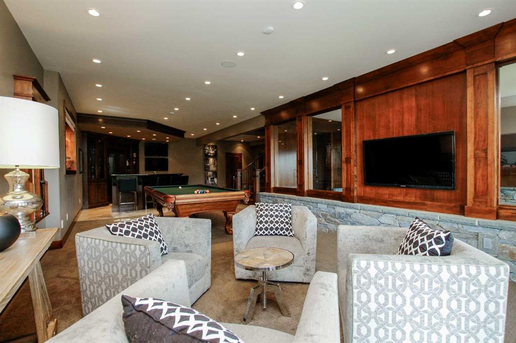FULLY DEVELOPED EXECUTIVE STYLE 2-STOREY LOCATED IN ONE OF RED DEER'S MOST PRESTIGIOUS LOCATIONS ~ BACKING ONTO AN ENVIRONMENTAL RESERVE & PIPER CREEK ~ EXPANSIVE PIE-SHAPED LOT, BEAUTIFULLY DESIGNED WITH LOW MAINTENANCE LANDSCAPING ~ LOADED WITH HIGH END FEATURES & FINISHINGS ~ This luxury home was custom built by Bowood Homes, , showcasing exceptional craftsmanship and attention to every detail ~ Covered front entry leads to a grand foyer with high ceilings that open to the upper level and accented with a chandelier ~ Great room with a sitting area opens to the dining room with a gas fireplace accented with tile and stone ~ Stylish wet bar features rich wood cabinetry, stone countertops and tile backsplash ~ The living room is flooded with natural light from the abundance of large windows and has garden door access to the partially covered deck ~ Gourmet kitchen features rich wood cabinetry with crown moulding, large drawers, lighted display cabinets, a full tile backsplash, stone countertops, oversized island with a butcher block section and a second sink, a premium Wolf gas range & a commercial style refrigerator ~Walk in pantry with built in shelving ~ The primary bedroom can easily accommodate a king size bed with room for a sitting area, spa like ensuite has dual sinks and a built in makeup counter, air tub, separate water closet & a steam shower ~ The walk in closet has built in shelving, dressers, & a bench with access to the laundry room w/built in cabinets, a folding counter, sink and sewing desk ~ Mudroom has more built in cabinets, large closets, & access to the triple attached garage (heated & fully finished) ~ Open staircase leads to the library with built in bookcases & an adjoining wet bar with built in cabinets, stone countertops ~ 2nd bedroom has a walk in closet and is located next to a 4 piece bath ~ Bonus room has vaulted ceilings, rows of recessed lighting, built in cabinets and a walk in storage closet ~ The bright and spacious walkout level is highlighted by a large recreation room with a wet bar featuring rich cabinetry, stone counters & a wine cellar, that opens to a sitting area with stone and wood details ~ Garden doors leading to the covered patio ~ Media room has built in cabinets and tiered seating ~ Home gym has floor to ceiling mirrors ~ 3 piece bath ~ 2 basement bedrooms have walk in closets, one has a 3 piece ensuite ~ 2nd laundry room next to bedrooms ~ The backyard oasis was professionally landscaped, has an irrigation system, putting green, gazebo and fire pit, tons of mature trees, shrubs and perennials, large storage shed, and unobstructed views ~ Convenient location close to all amenities with tons of great shopping and dining within walking distance in a one of a kind location ~ Pride of ownership is evident!