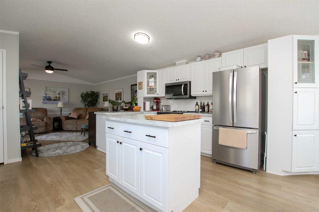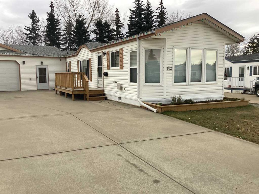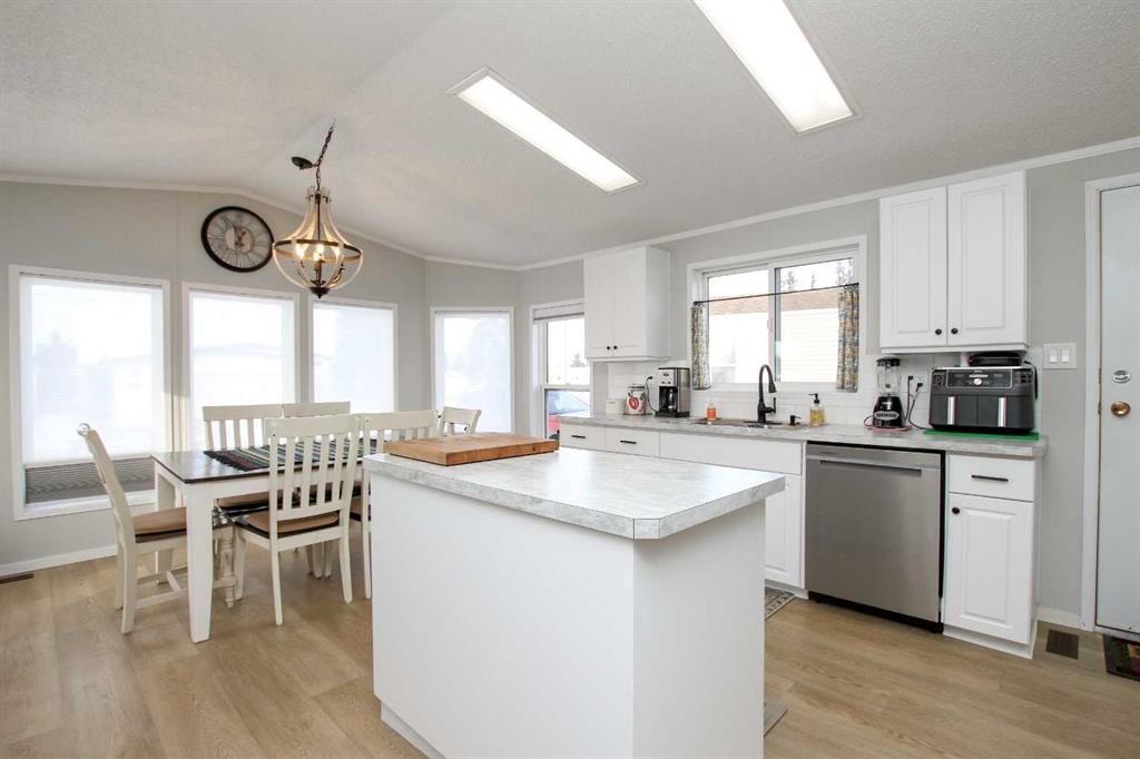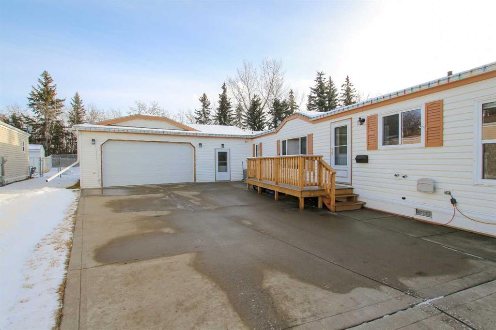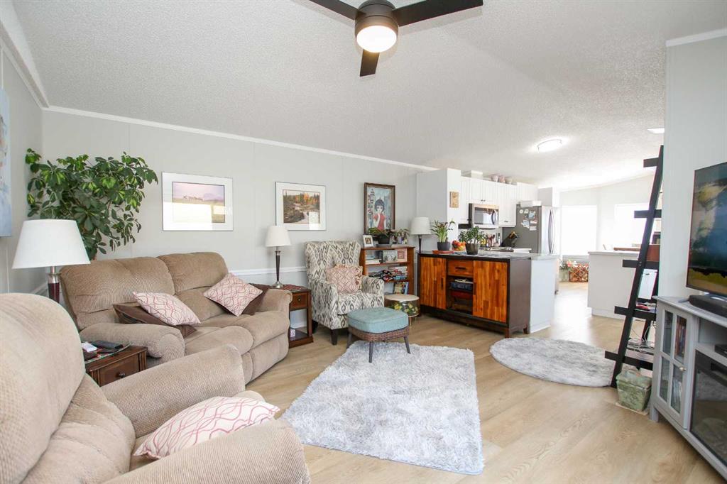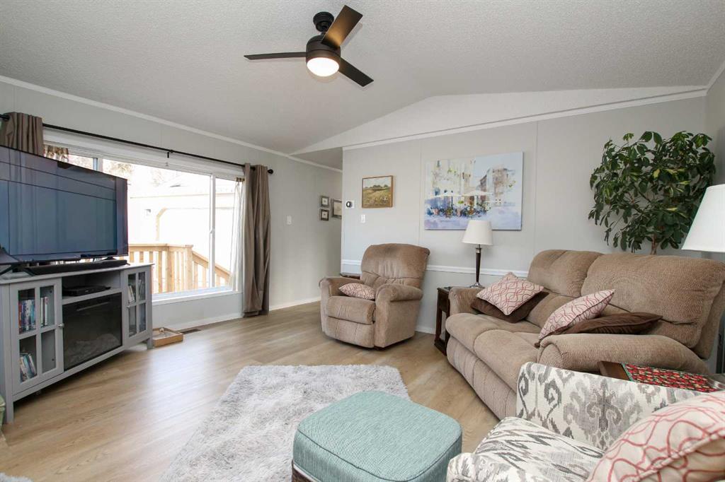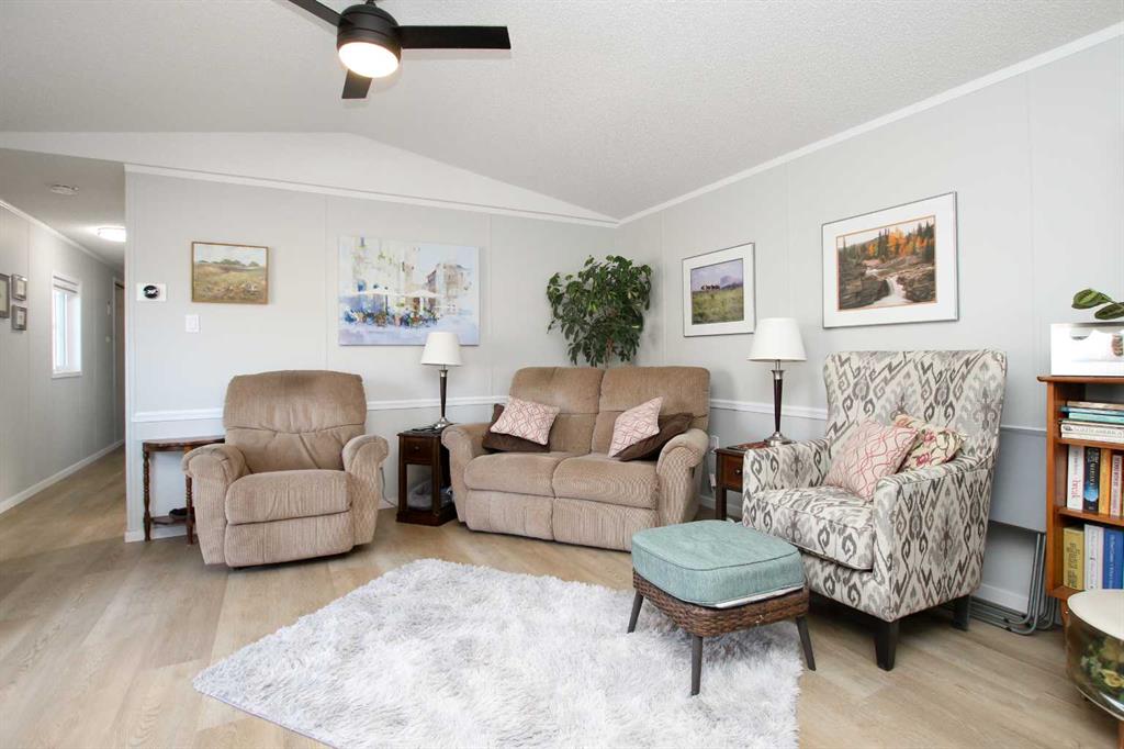 BEAUTIFULLY RENOVATED THROUGHOUT ~ 3 BEDROOMS, 2 BATHROOMS & A BONUS ROOM ~ HEATED DOUBLE ATTACHED GARAGE ~ Pride of ownership shines in this like-new home loaded with renovations including; new furnace, PEX plumbing, central air conditioning, vinyl plank flooring throughout, paint throughout, baseboards, bathrooms (toilets, sinks, faucets, tile, counter tops, shower & tub), kitchen (appliances, backsplash, faucet, sink, painted cabinets, countertops), LED lighting, ceiling fans, insulated overhead garage door, garage heater, bonus room heater, storm door, insulated skirting, heat tape and gutter (completed in 2025), shingles, 50 gallon hot water tank (2020) ~ Open concept main floor layout complemented by vaulted ceilings, vinyl plank flooring and tons of natural light creating a feeling of spaciousness ~ The living room features large windows offering natural light and overlooking the deck ~ The updated kitchen offers tons of cabinet and counter space including a large island, full tile backsplash, window above the sink, brand new stainless steel appliances, wall pantry, and a separate entry with access to the large newly built deck ~ Easily host large gatherings in the dining room with a wall of floor to ceiling windows that fill the space with natural light ~ The primary bedroom can easily accommodate a king size bed plus furniture, has a spacious walk in closet, and a spa like ensuite featuring a walk in shower with a glass door ~ 2 additional bedrooms are separated by the 4 piece main bathroom ~ Conveniently located laundry is just off the bedrooms and has built in cabinets for storage ~ The large bonus room has vinyl plank flooring, high ceilings and offers tons of space and flexibility to suit your needs (home gym, office, media room, craft/hobby room) ~ Separate entry from the bonus room (w/new storm door) leads to the fully fenced backyard with a storage shed, raised garden beds, fruit trees, and a 16' x 12' patio with a gazebo, all backing onto mature trees ~ Heated double attached garage has built in shelving, and an extra large driveway offering tons of parking space (snow blower included with the sale) ~ Located in the 40+ section, with awesome neighbours, and easy access to the Clubhouse with regularly scheduled activities and events ~ Secure gated RV storage available ~ Monthly lot fees are $505.00 ~ Situated minutes south of Red Deer, this home offers unbeatable convenience with a walking trail to Gasoline Alley, where you'll find a wide range of amenities, including the popular Gasoline Alley Farmers' Market, Costco, Cineplex and transit to Red Deer, with easy access to highway 2, making it an ideal location for families and commuters alike ~ Move in Ready!