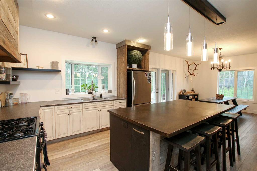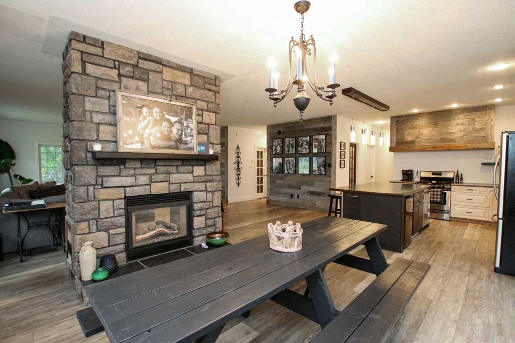 2,316 SQ. FT. BUNGALOW LOCATED ON 12.16 ACRES JUST MINUTES EAST OF SYLVAN ~ POTENTIAL TO SUBDIVIDE ~ OVERSIZED TRIPLE DETACHED GARAGE + NUMEROUS OUTBUILDINGS ~ SET UP FOR HORSES W/CORRALS, FENCING, SHELTER & WATERER ~ 42' x 7' covered front veranda welcomes you to this well cared for home ~ Open concept main floor layout is complemented by vinyl plank flooring and large windows offering tons of natural light ~ Double sided stone fireplace with a raised hearth and mantle separate the living and dining rooms ~ The kitchen offers a functional layout with plenty of cabinets, ample stone counter space including a large island with an eating bar, window above the sink overlooking the backyard and a large walk in pantry with floor to ceiling shelving ~ Easily host large gatherings in the dining room with garden doors access to the rear patio ~ The private primary bedroom is a generous size and can easily accommodate a king size bed with ample room for a sitting area, has a spacious walk in closet with built in shelving and a 5 piece ensuite with dual sinks, a walk in shower, and a jetted soaker tub ~ 3 additional bedrooms are all a generous size and have ample closet space ~ Updated 4 piece bathroom is centrally located, has a soaker tub, glass doors and a tile surround ~ Laundry is located in it's own room and has built in cabinets and a folding counter ~ Mud room has a separate entry with easy access to the triple detached garage and driveway ~ Treed fire pit area has a bunk house with power and large windows ~ Double detached garage/shop has an overhead door, and power ~ Horse barn, corrals, shelter and riding arena with horse waterer ~ Horseshoe pits, zip line and a huge dirt bike track ~ Preliminary subdivision plans have already been discussed and mapped with the county, showing potential for up to 6 acreages or 16 smaller parcels (subject to county approval). A solid opportunity for investors, developers, or buyers looking to establish a business or multi-use property ~ Located in Valley Meadows subdivision, just minutes east of Sylvan Lake with pavement to the driveway.