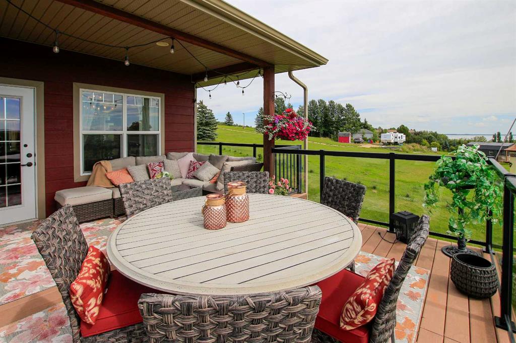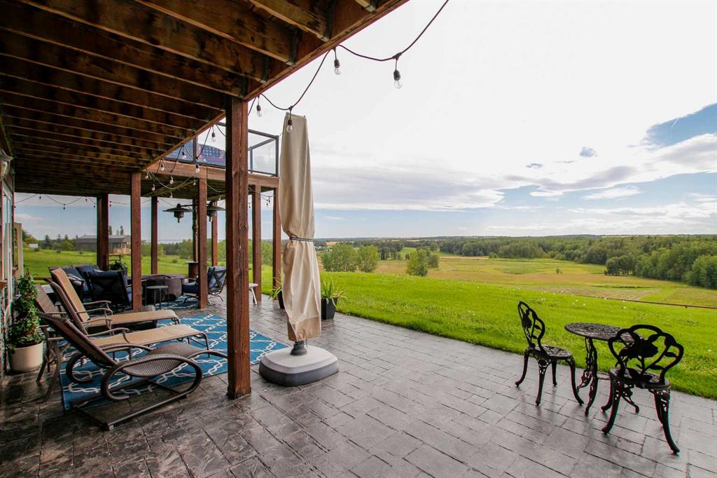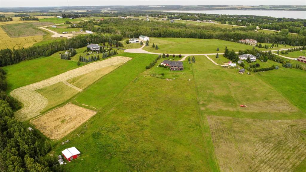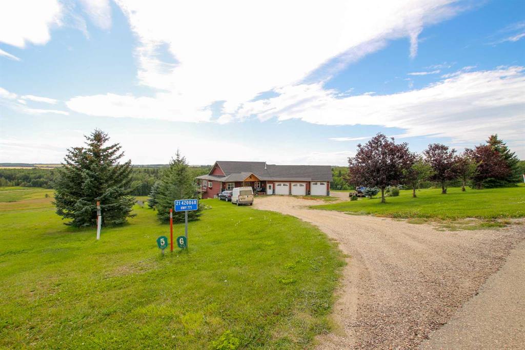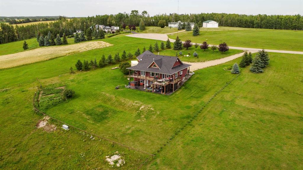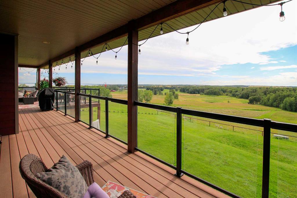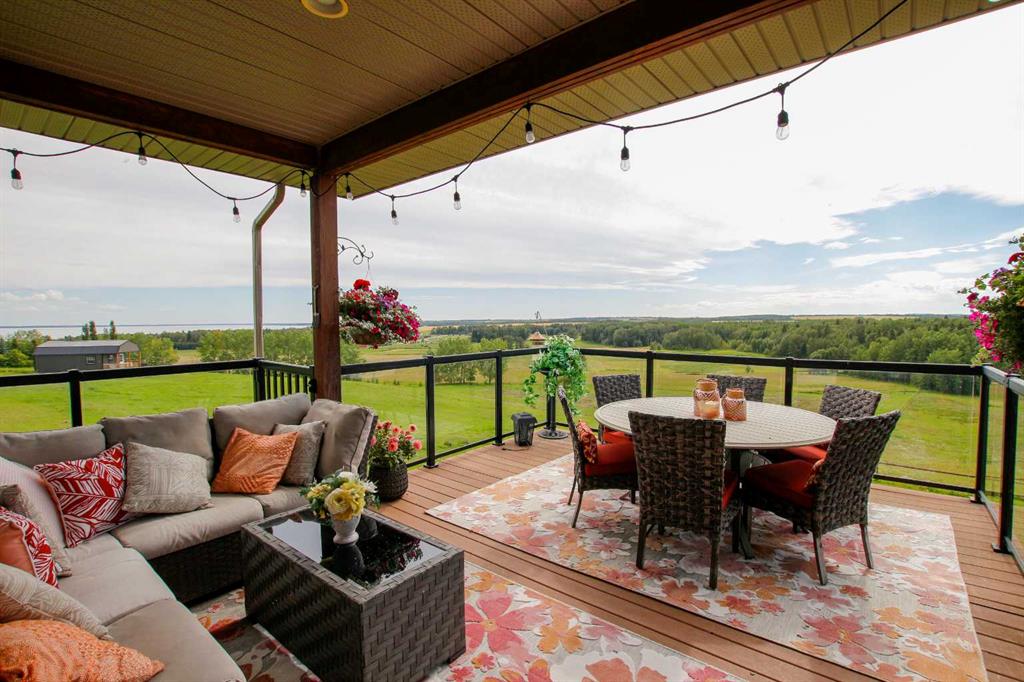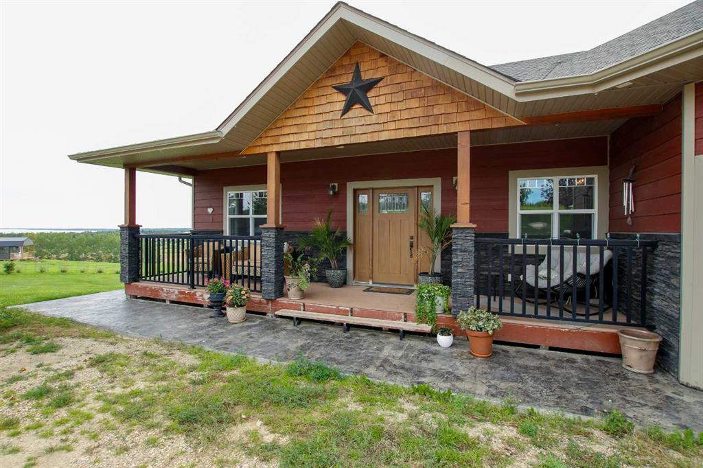 FULLY DEVELOPED WALKOUT BUNGALOW ON 6.67 ACRES ~ VIEWS OF GULL LAKE ~ SET UP FOR HORSES ~ HEATED TRIPLE GARAGE ~ NEW WINDOWS AND SHINGLES (2025) ~ Hardie Board exterior and an expansive covered front veranda welcome you and lead to the foyer with tile floors, a large closet, and room for a bench and table ~ Open concept main floor layout is complemented by an abundance of windows that fill the space with natural light and offer beautiful views of the rolling hills and Gull Lake ~ The kitchen comes well equipped with an abundance of custom cabinetry, ample stone countertops, massive island with an eating bar and second sink, full tile backsplash and a brick feature wall ~ Easily host large gatherings in the spacious dining room with garden door access to the partially covered wrap around deck with a BBQ gas line, composite deck boards, and aluminum railings ~ The living room features cathedral vaulted ceilings and a cozy fireplace with a raised hearth, mantle and floor to ceiling stacked stone surround ~ The primary bedroom oasis can easily accommodate a king size bed plus multiple pieces of furniture, has French doors to the deck, a generous size walk in closet with floor to ceiling organizers, and a spa like ensuite featuring an extra deep air tub with a view, walk in tile shower, and 2 sinks ~ 2nd bedroom has a large window overlooking the front veranda ~ Convenient main floor laundry room w/built in cabinets & plenty of counter space ~ 2 piece bath ~ Mud room with built in cabinets, a coat closet has access to the attached garage ~ Lighted stairs lead to the fully finished walkout basement with high ceilings and operational in floor heat ~ Massive family room has space for a sitting area, games area, home gym and more, with tons of floor to ceiling windows and garden door access to the partially covered lower patio, hot tub and backyard ~ 2 large bedrooms are perfect for teens or guests with plenty of space for a king size bed and furniture ~ 5 piece bathroom has an oversized vanity with dual sinks and extra storage cabinets, and a separate tub/shower and toilet ~ Large utility room, and flex room offer tons of storage space ~ 28/26' L x 42' W attached garage is insulated, heated, finished with OSB, has 3 overhead doors & 2 man doors ~ Other great features include; Water softener, central vacuum, Complete window glass replacement with energy-efficient, argon-filled double-pane units ~ Outside there is plenty of space with 6.67 acres of land, beautiful views plus a fully fenced pasture with a barn - perfect for horses ~ Minutes to Parkland Beach with public beach access, boat launch, golf course and more, easy access to Rimbey and Bentley.