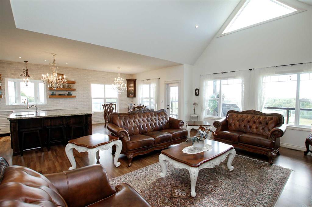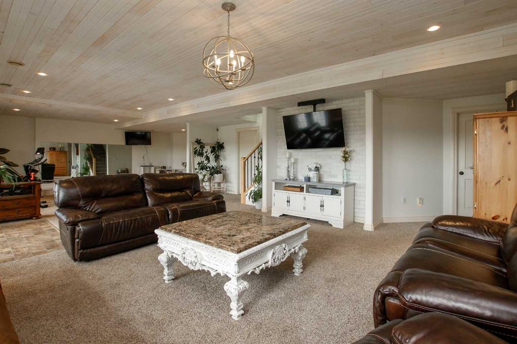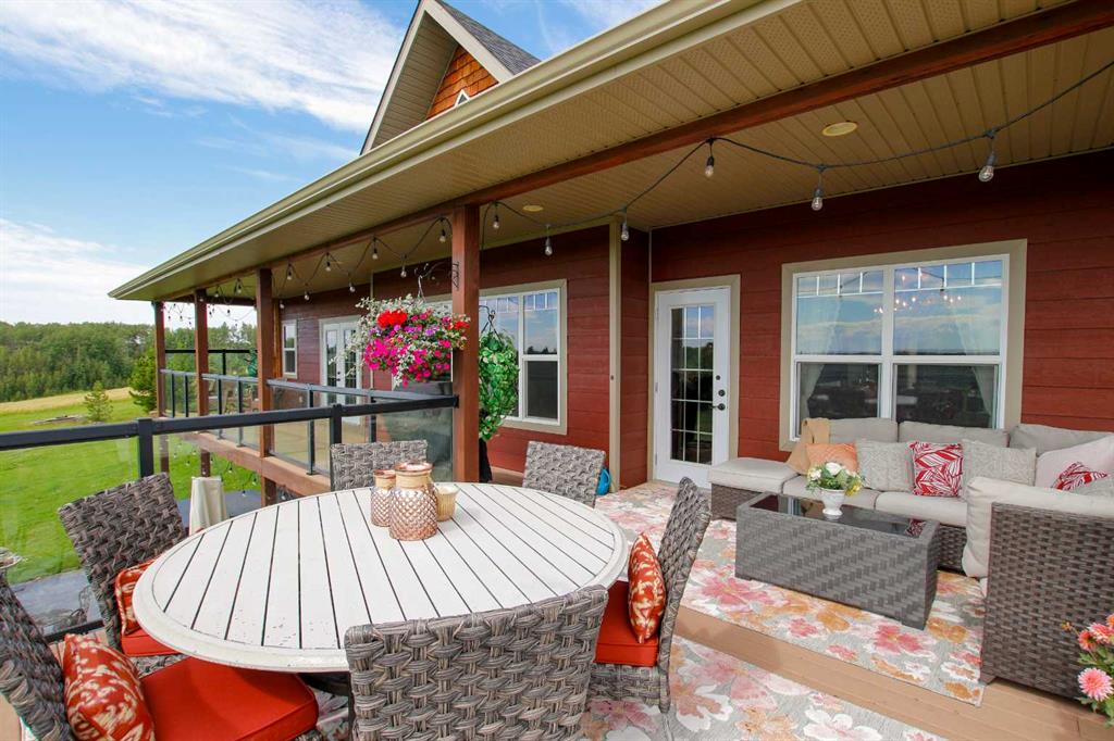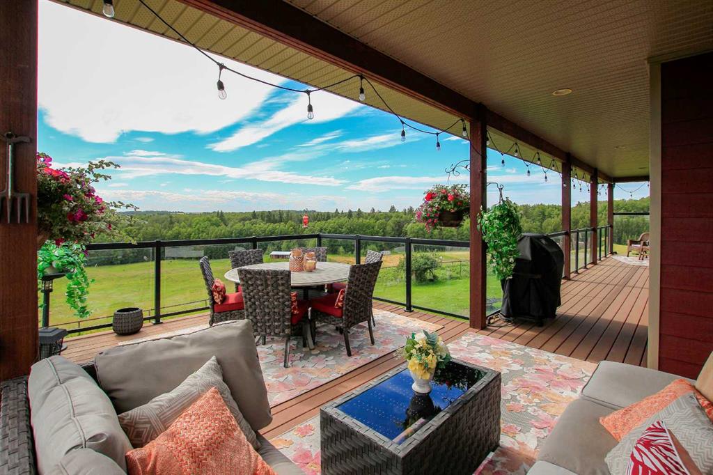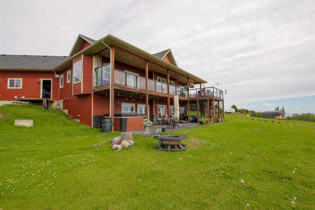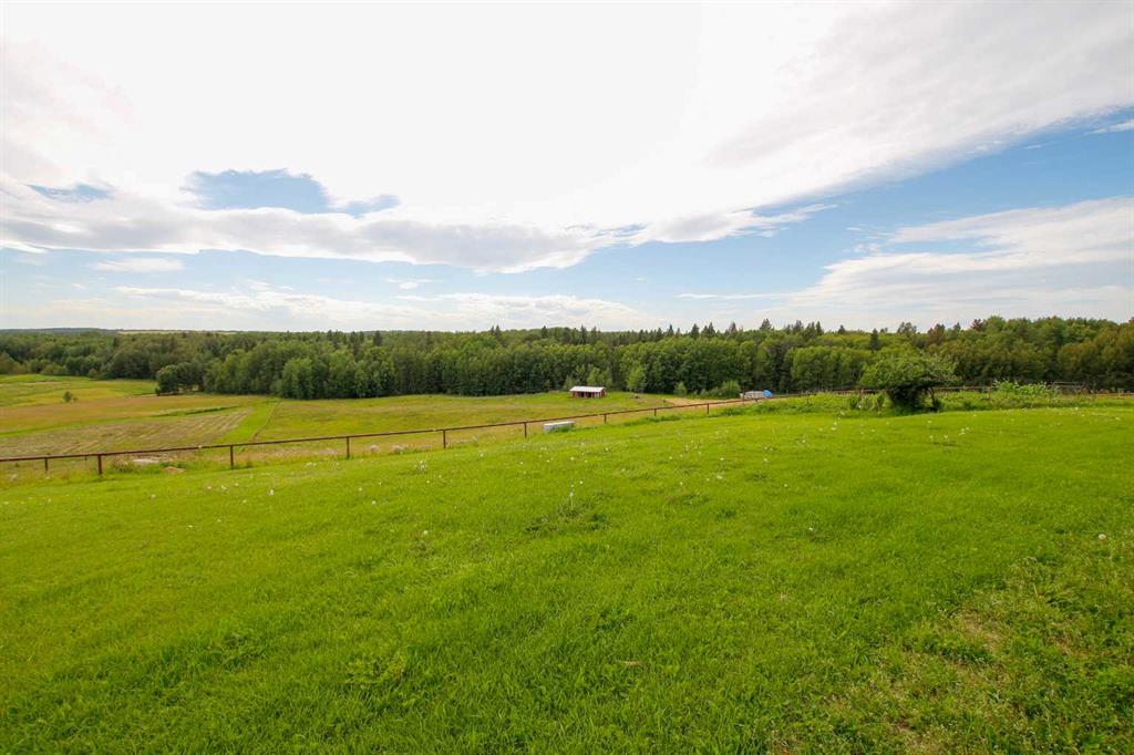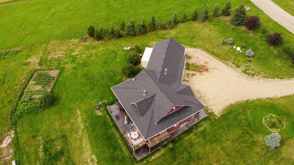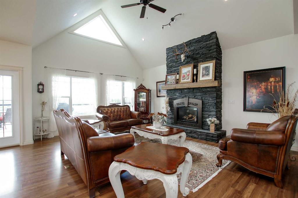 FULLY DEVELOPED WALKOUT BUNGALOW ON 6.67 ACRES ~ VIEWS OF GULL LAKE ~ SET UP FOR HORSES ~ HEATED TRIPLE GARAGE ~ NEW WINDOWS AND SHINGLES (2025) ~ Hardie Board exterior and an expansive covered front veranda welcome you and lead to the foyer with tile floors, a large closet, and room for a bench and table ~ Open concept main floor layout is complemented by an abundance of windows that fill the space with natural light and offer beautiful views of the rolling hills and Gull Lake ~ The kitchen comes well equipped with an abundance of custom cabinetry, ample stone countertops, massive island with an eating bar and second sink, full tile backsplash and a brick feature wall ~ Easily host large gatherings in the spacious dining room with garden door access to the partially covered wrap around deck with a BBQ gas line, composite deck boards, and aluminum railings ~ The living room features cathedral vaulted ceilings and a cozy fireplace with a raised hearth, mantle and floor to ceiling stacked stone surround ~ The primary bedroom oasis can easily accommodate a king size bed plus multiple pieces of furniture, has French doors to the deck, a generous size walk in closet with floor to ceiling organizers, and a spa like ensuite featuring an extra deep air tub with a view, walk in tile shower, and 2 sinks ~ 2nd bedroom has a large window overlooking the front veranda ~ Convenient main floor laundry room w/built in cabinets & plenty of counter space ~ 2 piece bath ~ Mud room with built in cabinets, a coat closet has access to the attached garage ~ Lighted stairs lead to the fully finished walkout basement with high ceilings and operational in floor heat ~ Massive family room has space for a sitting area, games area, home gym and more, with tons of floor to ceiling windows and garden door access to the partially covered lower patio, hot tub and backyard ~ 2 large bedrooms are perfect for teens or guests with plenty of space for a king size bed and furniture ~ 5 piece bathroom has an oversized vanity with dual sinks and extra storage cabinets, and a separate tub/shower and toilet ~ Large utility room, and flex room offer tons of storage space ~ 28/26' L x 42' W attached garage is insulated, heated, finished with OSB, has 3 overhead doors & 2 man doors ~ Other great features include; Water softener, central vacuum, Complete window glass replacement with energy-efficient, argon-filled double-pane units ~ Outside there is plenty of space with 6.67 acres of land, beautiful views plus a fully fenced pasture with a barn - perfect for horses ~ Minutes to Parkland Beach with public beach access, boat launch, golf course and more, easy access to Rimbey and Bentley.