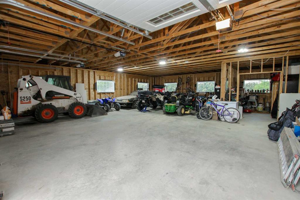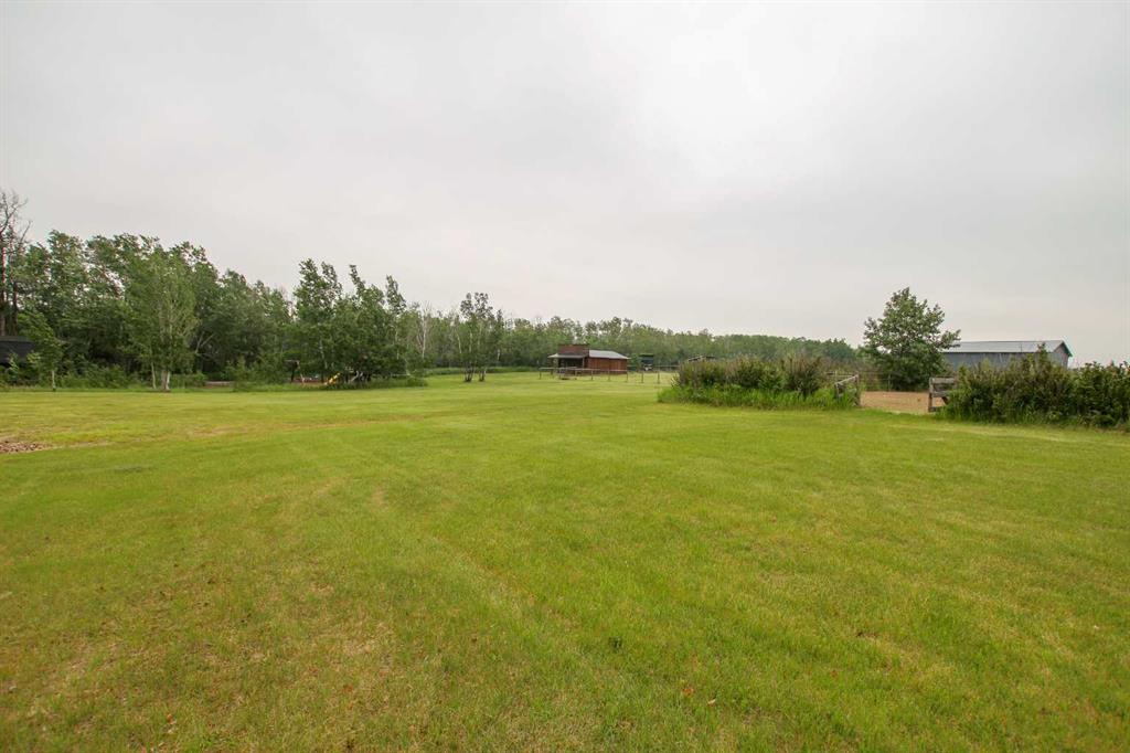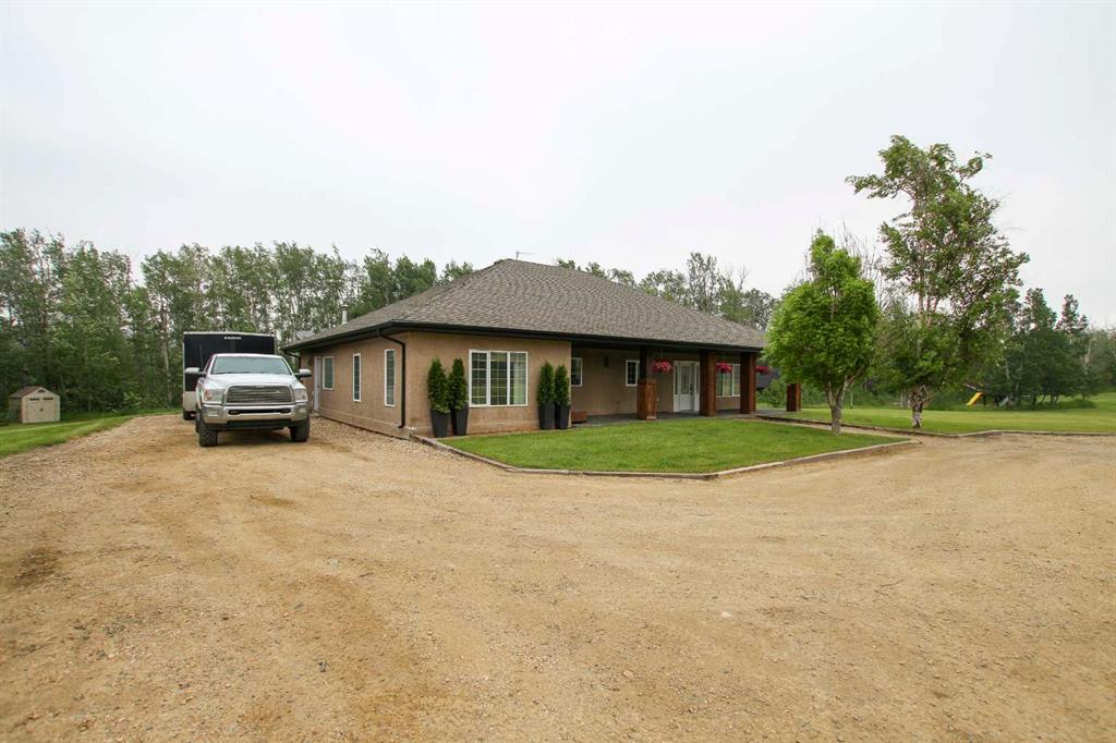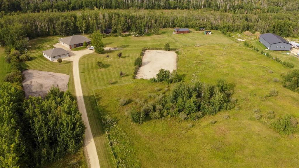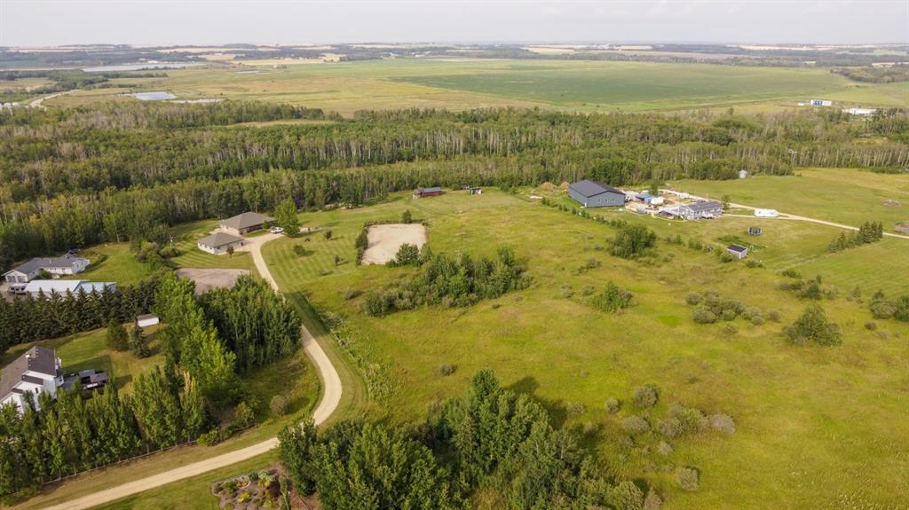 2,316 SQ. FT. BUNGALOW LOCATED ON 12.16 ACRES JUST MINUTES EAST OF SYLVAN ~ POTENTIAL TO SUBDIVIDE ~ OVERSIZED TRIPLE DETACHED GARAGE + NUMEROUS OUTBUILDINGS ~ SET UP FOR HORSES W/CORRALS, FENCING, SHELTER & WATERER ~ 42' x 7' covered front veranda welcomes you to this well cared for home ~ Open concept main floor layout is complemented by vinyl plank flooring and large windows offering tons of natural light ~ Double sided stone fireplace with a raised hearth and mantle separate the living and dining rooms ~ The kitchen offers a functional layout with plenty of cabinets, ample stone counter space including a large island with an eating bar, window above the sink overlooking the backyard and a large walk in pantry with floor to ceiling shelving ~ Easily host large gatherings in the dining room with garden doors access to the rear patio ~ The private primary bedroom is a generous size and can easily accommodate a king size bed with ample room for a sitting area, has a spacious walk in closet with built in shelving and a 5 piece ensuite with dual sinks, a walk in shower, and a jetted soaker tub ~ 3 additional bedrooms are all a generous size and have ample closet space ~ Updated 4 piece bathroom is centrally located, has a soaker tub, glass doors and a tile surround ~ Laundry is located in it's own room and has built in cabinets and a folding counter ~ Mud room has a separate entry with easy access to the triple detached garage and driveway ~ Treed fire pit area has a bunk house with power and large windows ~ Double detached garage/shop has an overhead door, and power ~ Horse barn, corrals, shelter and riding arena with horse waterer ~ Horseshoe pits, zip line and a huge dirt bike track ~ Preliminary subdivision plans have already been discussed and mapped with the county, showing potential for up to 6 acreages or 16 smaller parcels (subject to county approval). A solid opportunity for investors, developers, or buyers looking to establish a business or multi-use property ~ Located in Valley Meadows subdivision, just minutes east of Sylvan Lake with pavement to the driveway.