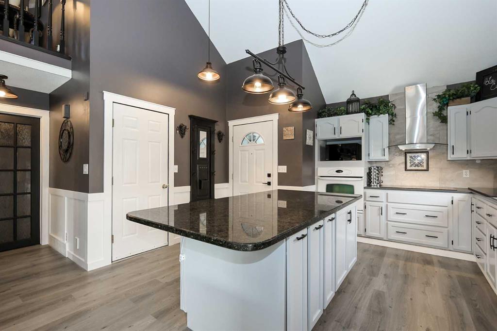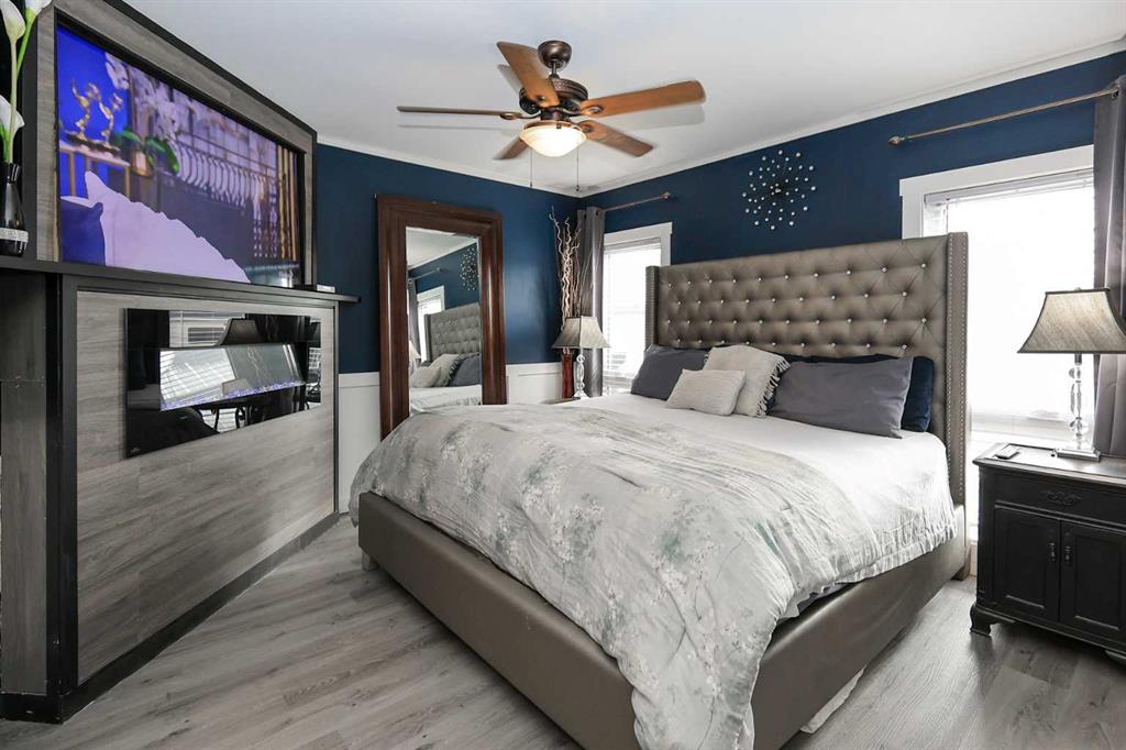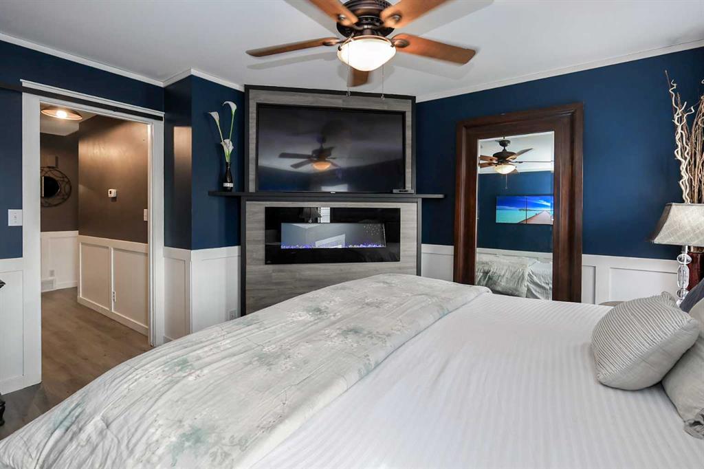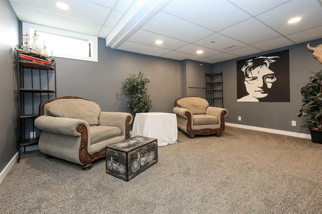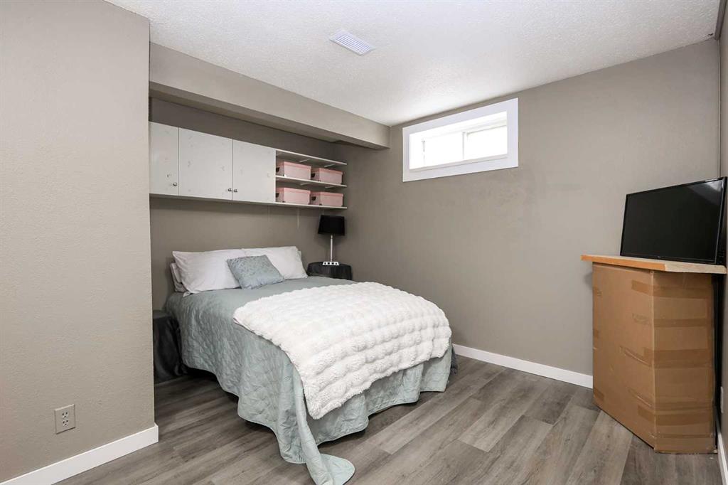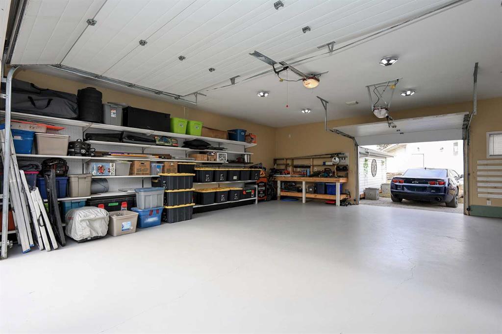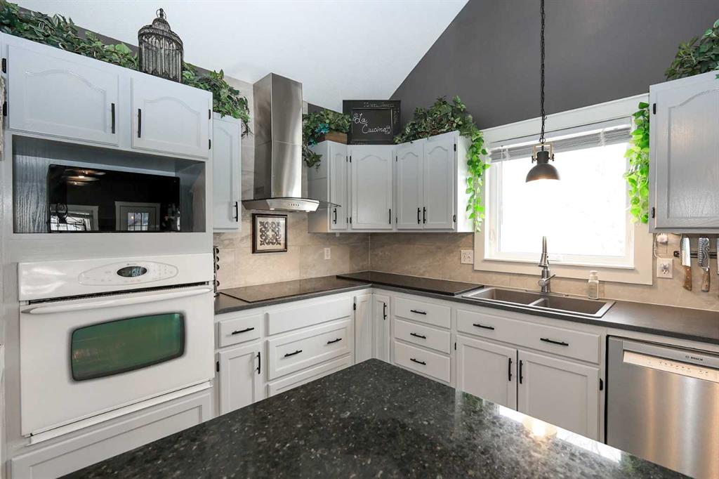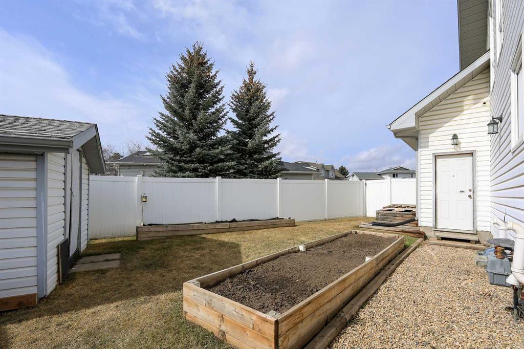 FULLY DEVELOPED 3 BEDROOM, 3 BATHROOM BUNGALOW W/LOFT ~ 2 DOUBLE GARAGES + RV PARKING ~ LARGE PIE LOT WITH SOUTH FACING BACKYARD ~ Some of the many recent updates include: Flooring, paint, light fixtures, appliances (2024), all new PEX plumbing, new windows (2022), furnace and hot water tank (2017) ~ Covered front entry welcomes you to this well cared for home ~ Open concept main floor layout with soaring vaulted ceilings and vinyl plank flooring creates a feeling of spaciousness ~ The kitchen offers a functional layout with plenty of white cabinets, including a large island with a granite counters, counter height eating bar, full tile backsplash, window above the sink, and upgraded stainless steel appliances ~ The living/dining room is filled with natural light from the abundance of windows and offers garden door access to the two tiered deck and backyard ~ Spacious primary bedroom can easily accommodate a king size bed, has a cozy fireplace, a large walk in closet and a spa like ensuite with a soaker tub ~ Conveniently located main floor laundry is located next to the updated 4 piece main bathroom ~ Open staircase overlooks the main level below and leads to the upper level bonus room featuring a cozy fireplace feature wall ~ The fully finished basement offers a large family room, 2 generous size bedrooms including one with a cheater door to the 4 piece bathroom ~ Huge storage room with a workbench and sink ~ 24' L x 20' W attached garage is insulated, finished with paint and drywall, and has a man door to the backyard ~ Sunny south facing backyard is fully fenced with vinyl fencing, has raised garden beds, high producing fruit trees, a garden shed, stamped concrete walkways, plenty of yard space, and an oversized 28' L x 26' W detached garage with underfloor heat roughed in and two overhead doors giving drive through access to the backyard ~ Rear parking pad behind the garage has space for an RV/boat/quads ~ Located in a quiet cul-de-sac with easy access to walking trails, parks, playgrounds, multiple schools, tons of shopping and all other amenities close by.